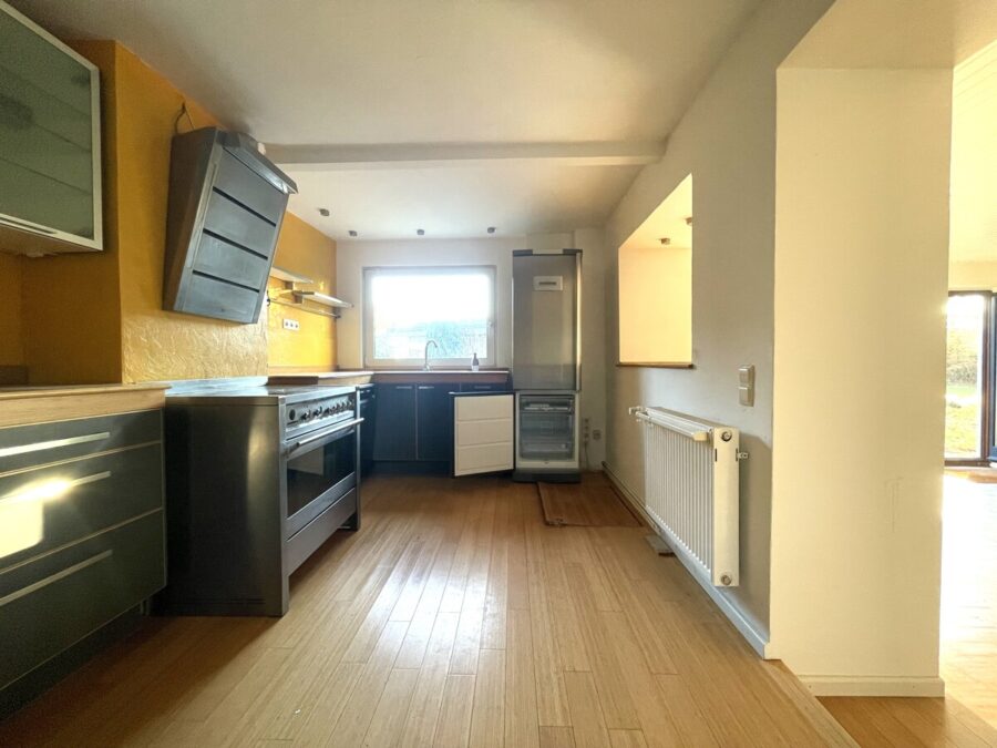 Im Erdgeschoss befindet sich eine offene und großzügige Küche, die nahtlos in den angrenzenden Wohnbereich übergeht. Dieser Bereich bildet das Herzstück des Hauses und bietet viel Raum für gemeinsame Stunden mit der Familie. Er ist ideal für das tägliche Leben und lädt zu gemeinsamen Aktivitäten und entspannten Abenden ein.
