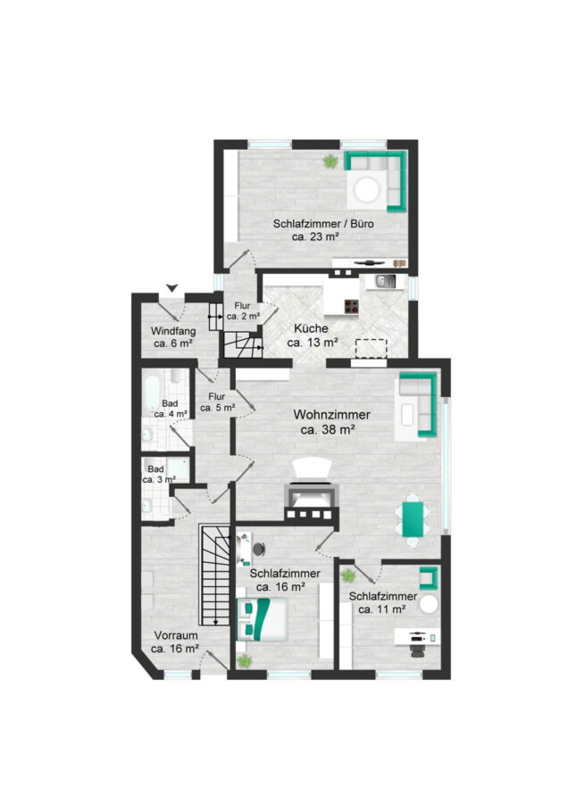 Im Erdgeschoss befindet sich eine offene und großzügige Küche, die nahtlos in den angrenzenden Wohnbereich übergeht. Dieser Bereich bildet das Herzstück des Hauses und bietet viel Raum für gemeinsame Stunden mit der Familie. Er ist ideal für das tägliche Leben und lädt zu gemeinsamen Aktivitäten und entspannten Abenden ein.