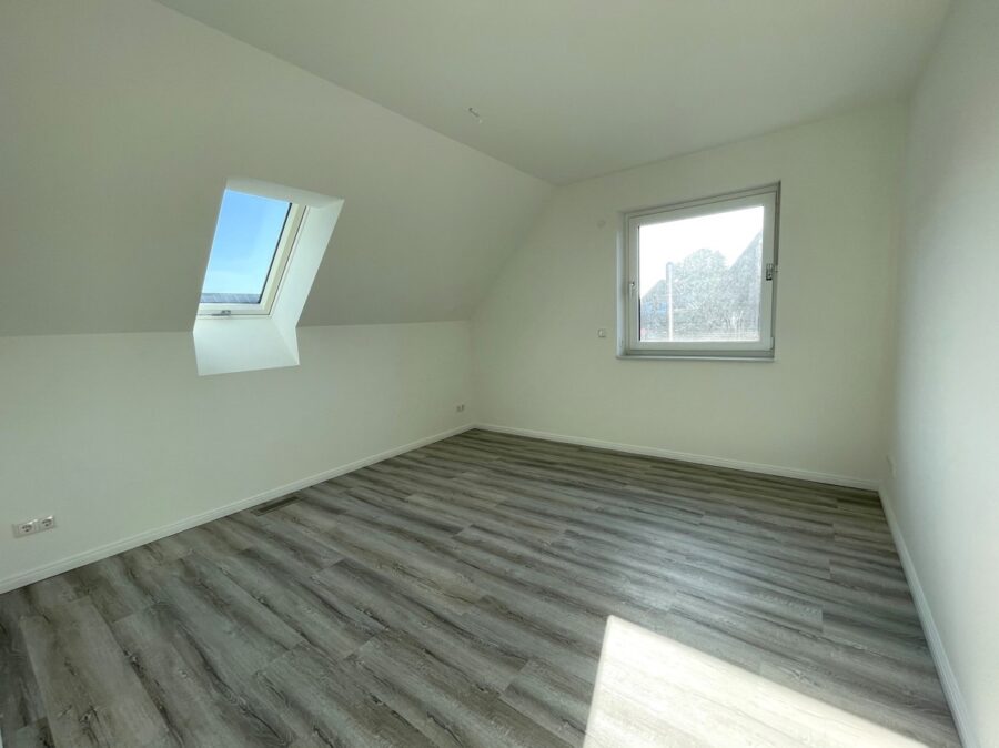 Nach dem Betreten der Immobilie gelangen Sie von dem einladenden Flur in den großzügigen Hauswirtschaftsraum. Dort befindet sich neben dem Anschluss für die Waschmaschine und den Trockner auch die Heizungsanlage (Wärmepumpe mit Be-und Entlüftungsanlage). Gegenüber erreichen Sie das Gästebad mit Dusche und Fenster. In den offenen Wohn- und Küchenbereich gelangen Sie am Ende des Flurs. Die hochwertige Einbauküche ist modern gestaltet und verfügt über Elektromarkengeräte. Der Küchenbereich ist mit grauen Fliesen ausgestattet. Der Wohnbereich und die restlichen Zimmer im Haus wurden einheitlich mit Designboden versehen. Über die im Flur befindliche Holztreppe gelangen Sie in das Obergeschoss. Hier erwarten Sie drei Schlafzimmer und ein Vollbad. Die drei Schlafzimmer sind hinsichtlich der Größe nahezu identisch und überzeugen aufgrund der bodentiefen Fenster Elemente. Das Vollbad rundet das Obergeschoss ab. Die Walk-In Dusche, die Badewanne, das Waschbecken, das WC, der Handtuchheizkörper sowie das Fenster sorgen dafür, dass es Ihnen an nichts fehlt. Das Erdgeschoss und das Obergeschoss sind zudem mit einer Fußbodenheizung ausgestattet. Der Spitzboden bietet Stellfläche oder Raum für ein Büro. Jedes Fenster des Hauses verfügt über elektrische Außenrollläden.