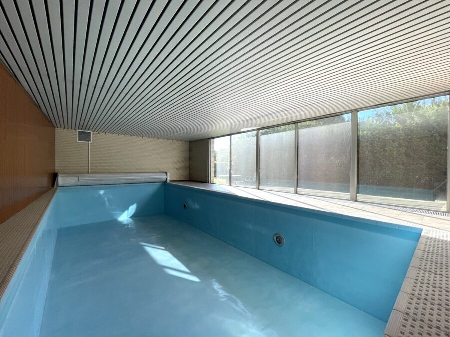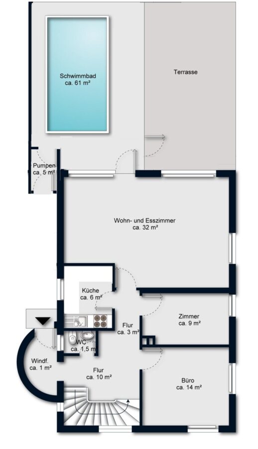 Die Küche verfügt über eine praktische Durchreiche und könnte bei Bedarf zum Essbereich hin geöffnet werden. Das angrenzende Wohn- und Esszimmer bietet direkten Zugang zum Poolbereich. Von dort gelangen Sie auf die Terrasse und in den nicht einsehbaren Garten.