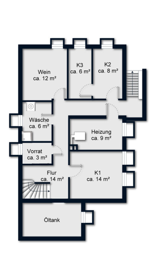 Das Haus ist vollständig unterkellert und bietet neben diversen Abstell- und Funktionsräumen auch die Heizungsanlage aus dem Jahr 2003. Ein Außenzugang vom Keller ins Freie ist ebenfalls vorhanden.