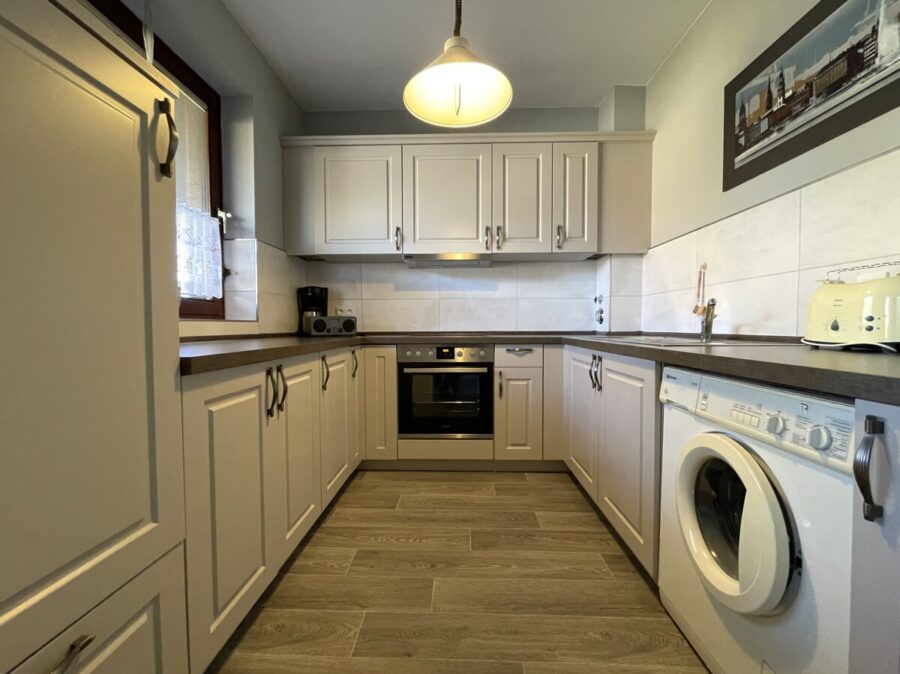 Die Küche schließt direkt an das Wohnzimmer an und ist mit einer modernen, kaum genutzten Einbauküche ausgestattet. Beige Fronten und hochwertige Elektrogeräte verleihen ihr ein zeitlos elegantes Erscheinungsbild.