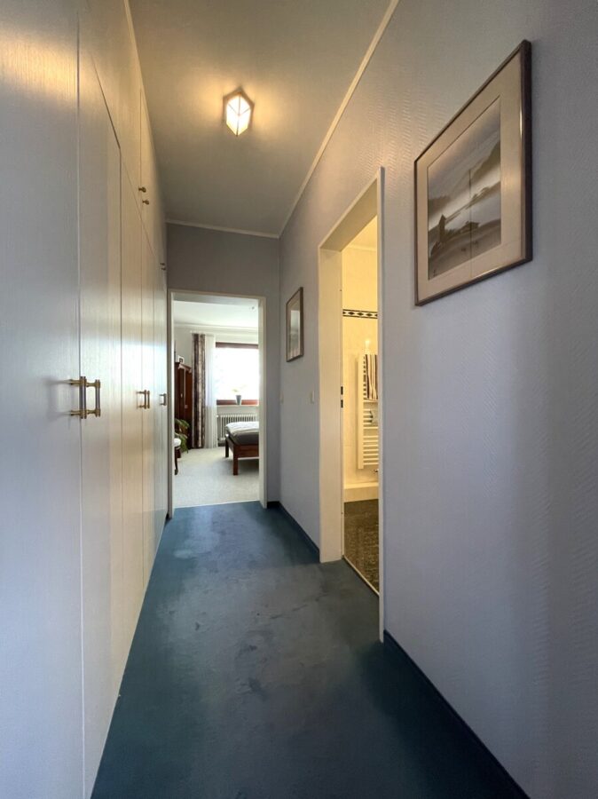 Die großzügige Diele bietet ausreichend Platz für einen kleinen Esstisch und schafft somit eine angenehme Wohnraumerweiterung. Im Flur, der zum Badezimmer und Schlafzimmer führt, befindet sich ein praktischer Einbauschrank mit weißen Fronten bis zur Decke – ideal für zusätzlichen Stauraum.
