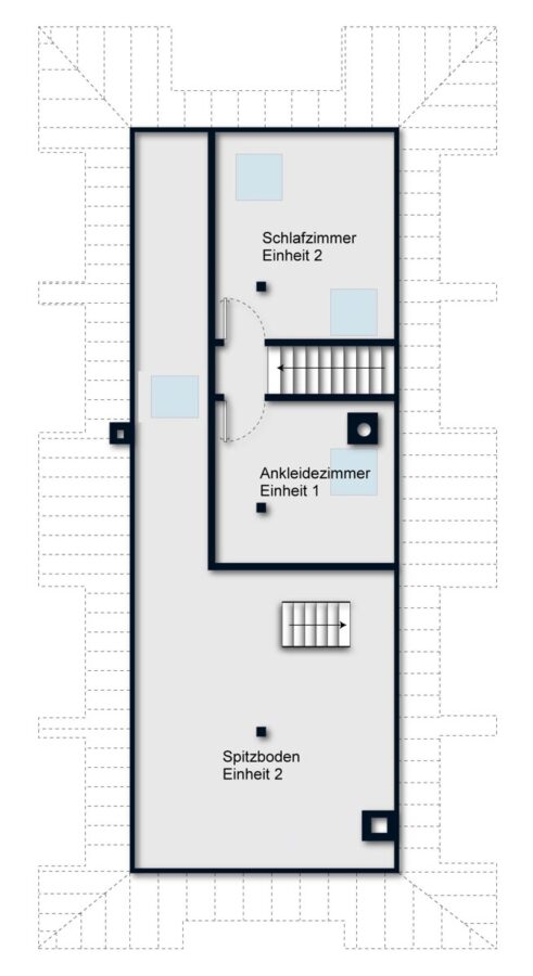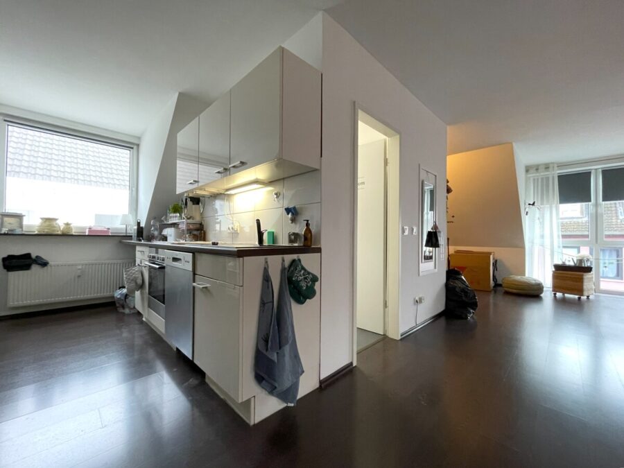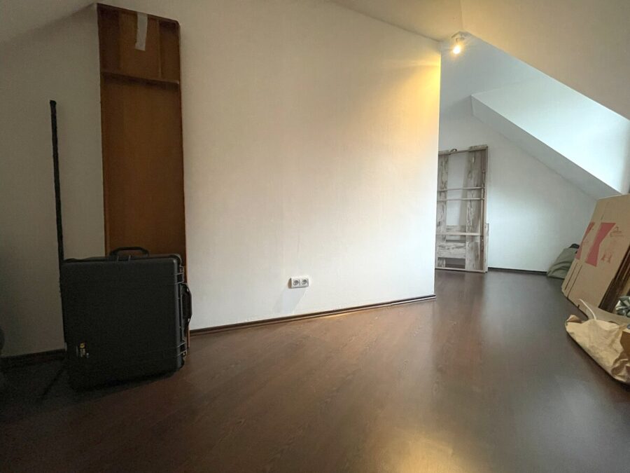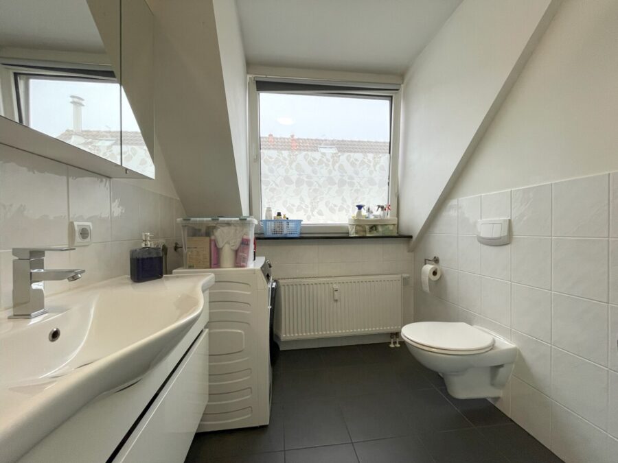Die zweite, kleinere Einheit verfügt über ca. 55 m² Wohnfläche, verteilt auf drei Zimmer, Küche und Bad. Sie erstreckt sich über zwei Ebenen – Dachgeschoss und ausgebauten Spitzboden – die über eine Holztreppe miteinander verbunden sind. Das innenliegende Duschbad ist modern gestaltet mit grauen Boden- und weißen Wandfliesen, ausgestattet mit einem freihängenden WC, einem Bidet und Platz für eine Waschmaschine. Die vorhandene Einbauküche verfügt über Elektrogeräte namhafter Hersteller. Diese Einheit ist aktuell vermietet für ca. 600 € Kaltmiete pro Monat.