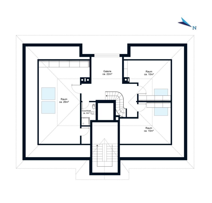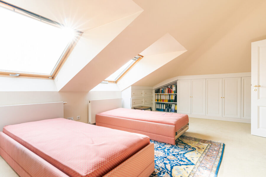 Über eine stilvolle Innentreppe gelangt man in das obere Geschoss. Hier öffnet sich eine helle Galerie, deren große Velux-Fenster für ein offenes und freundliches Raumgefühl sorgen. Von der Galerie aus besteht Zugang zu drei weiteren Räumen sowie einem hell gefliesten Duschbad. Die Galerie und die drei Räume sind ebenfalls mit maßgefertigten weißen Einbauschränken ausgestattet und bieten vielfältige Nutzungsmöglichkeiten – als Schlaf-, Arbeits- oder Hobbyräume.