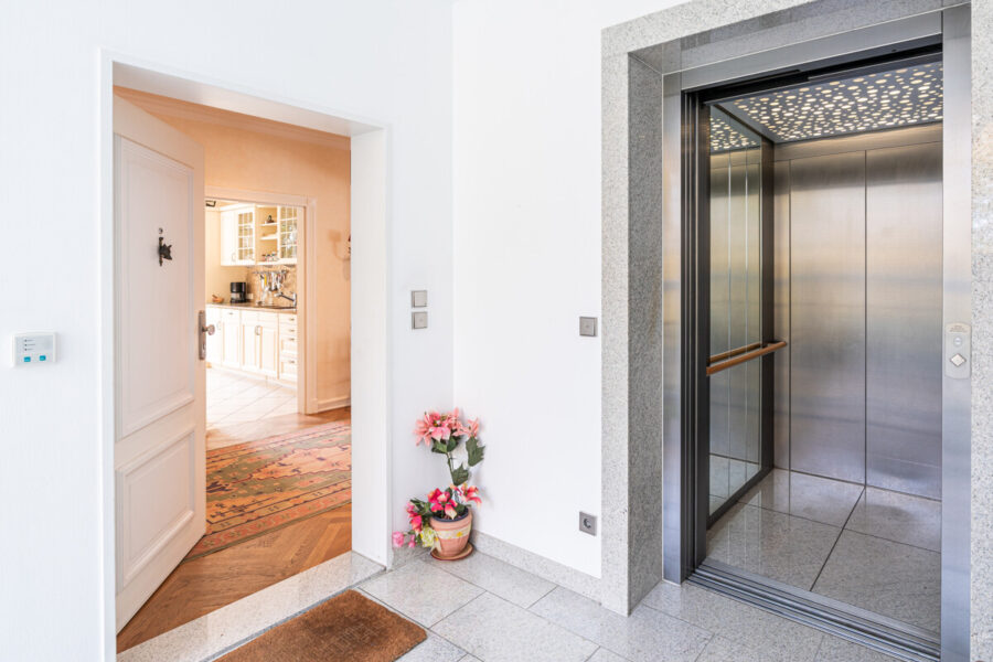 Die Wohnung erstreckt sich über zwei Ebenen und wird über ein großzügiges Treppenhaus mit Aufzug erschlossen. Der Fahrstuhl befindet sich derzeit im Hausflur, kann jedoch bei Bedarf direkt in die Wohnung geführt werden, was den Wohnkomfort zusätzlich erhöht.