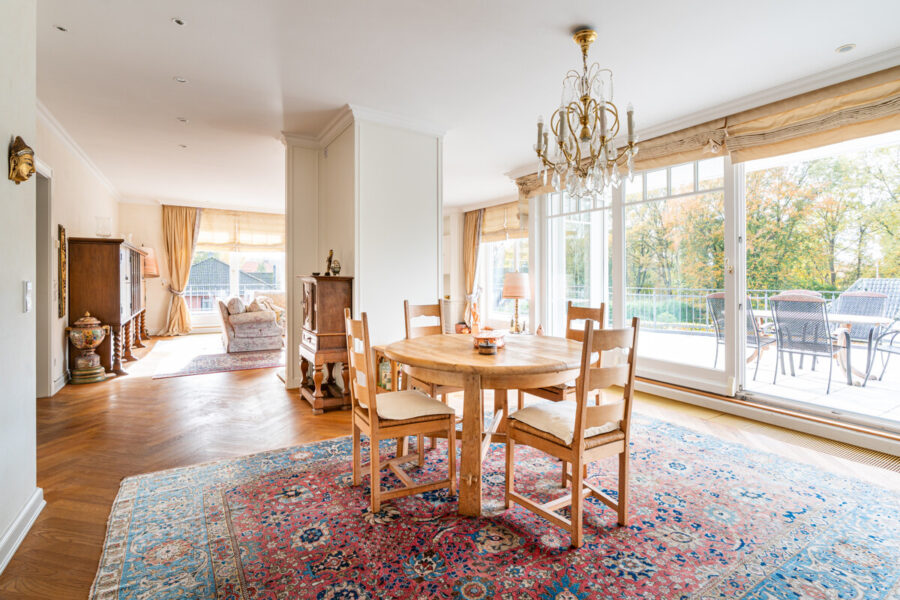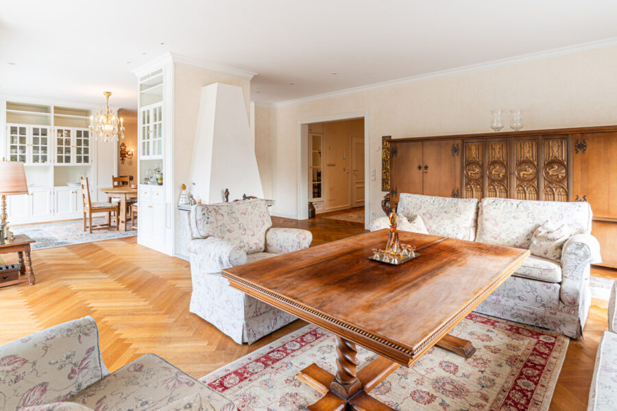 Der weitläufige Wohnbereich ist mit hochwertigem Eichenparkett im Fischgrätmuster ausgestattet und verfügt über einen offenen Kamin, der für eine angenehme Wohnstimmung sorgt. Von hier aus gelangt man auf die umlaufende Dachterrasse, die die Wohnung nahezu vollständig umgibt. Sie ist von allen Zimmern der unteren Etage aus begehbar und bietet verschiedene Aufenthaltsbereiche mit Blick ins Grüne über die Nachbarschaft. Zwei Wasseranschlüsse und mehrere Steckdosen ermöglichen eine vielseitige Nutzung des Außenbereichs.