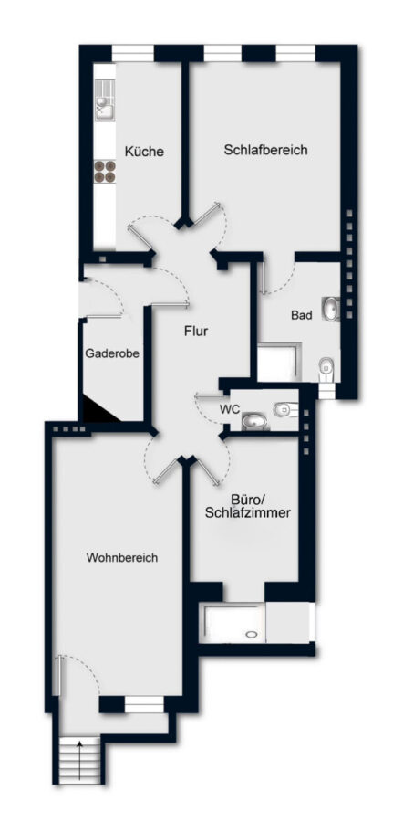 Direkt hinter der Zugangstür vom Treppenhaus befindet sich ein praktischer Garderobenbereich, der zusätzlichen Stauraum bietet. Der großzügige Flur bietet darüber hinaus ausreichend Platz für den Einbau eines Einbauschranks. Das Gäste-WC ist ebenfalls vom Flur aus erreichbar.