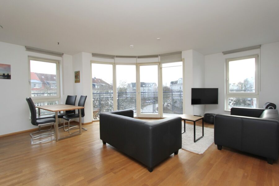 Durch die verbauten bodentiefen Fenster, wirkt der Raum hell und freundlich. Über den geräumigen Balkon mit Süd-Ost Ausrichtung, hat man durch die Lage im 4. Stock einen schönen und offenen Blick über Eppendorf.
