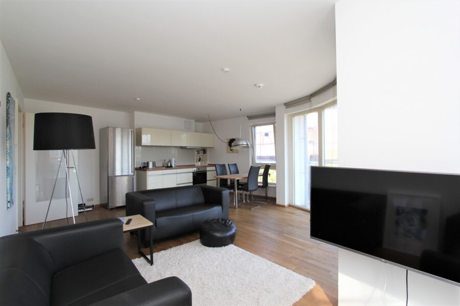 Den großzügigen und hellen Wohn-/Essbereich erreicht man auf der linken Seite vom Flur aus. In diesem befindet sich die offene Küche, die mit einer neuwertigen hellen Einbauküche ausgestattet ist. Zur Ausstattung zählt ein großer freistehender Kühlschrank, ein Backofen, ein Herd sowie ein Geschirrspüler.